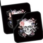 These skull‑and‑rose potholders protect your hands and honor your fire.